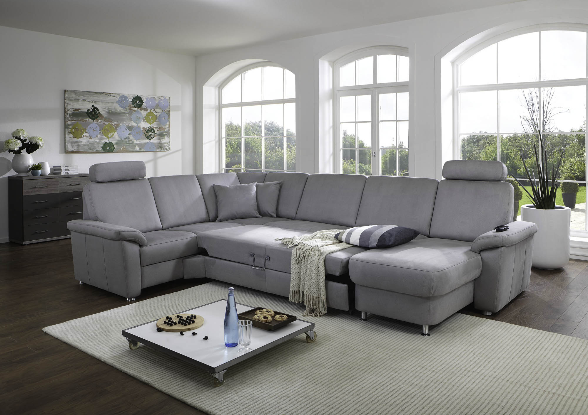 Es verfügt über eine Super-Bonell-Federkernpolsterung mit dauerelastischen Wellenfedern für maximale Bequemlichkeit. Eine Relaxfunktion im Eckelement sorgt für zusätzliche Entspannung. Das Sofa bietet auch eine praktische Schlaffunktion und viel Stauraum in großen Schubladen. Es gibt eine große Auswahl an Bezügen und Polsterzusammenstellungen. Zusätzlich gibt es TV-Sessel, die auf Knopfdruck in eine liegende Position gebracht werden können, für ein traumhaftes Fernseherlebnis.